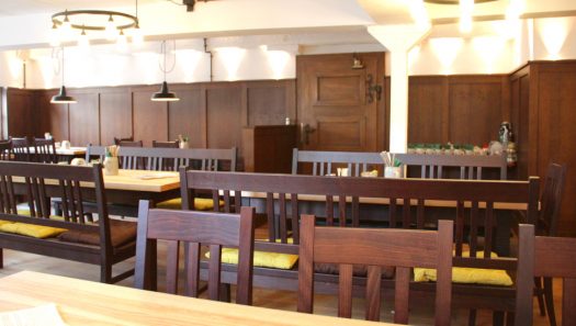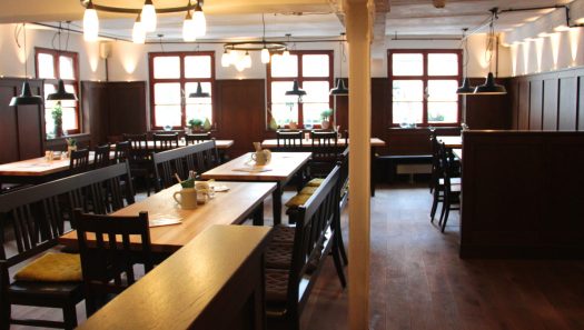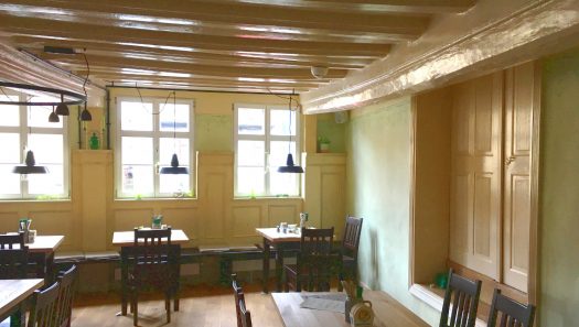 Der Grüne Baum wurde rundum erneuert, in diesem Zuge wurde auch das Innenleben umgestaltet und modernisiert. Die hohe Investition des Eigentümers hat sich gelohnt, denn nun strahlt das alte Gebäude in neuem Glanz. Im ersten Obergeschoss befindet sich der große Saal mit Galerie, der vielseitig als Veranstaltungsraum für sämtliche Events genutzt werden kann. Auch die kleine Gaststube im ersten Obergeschoss ist ein architektonisches Kleinod mit aufwändigen Wandmalereien auf den historischen Mauern. Bei der Sanierung- dieses ehemaligen Küchenraums -, wurden alte Deckenbalken freigelegt, die sich bereits auf das Jahr 1607 – demnach noch vor den Zerstörungen im Dreißigjährigen Krieg – bestimmen ließen. Die Räume erstahlen jetzt in hellen Farbtönen. Der Innenhof wurde mit einem lichtdurchfluteten Glasvorbau aufgewertet.
